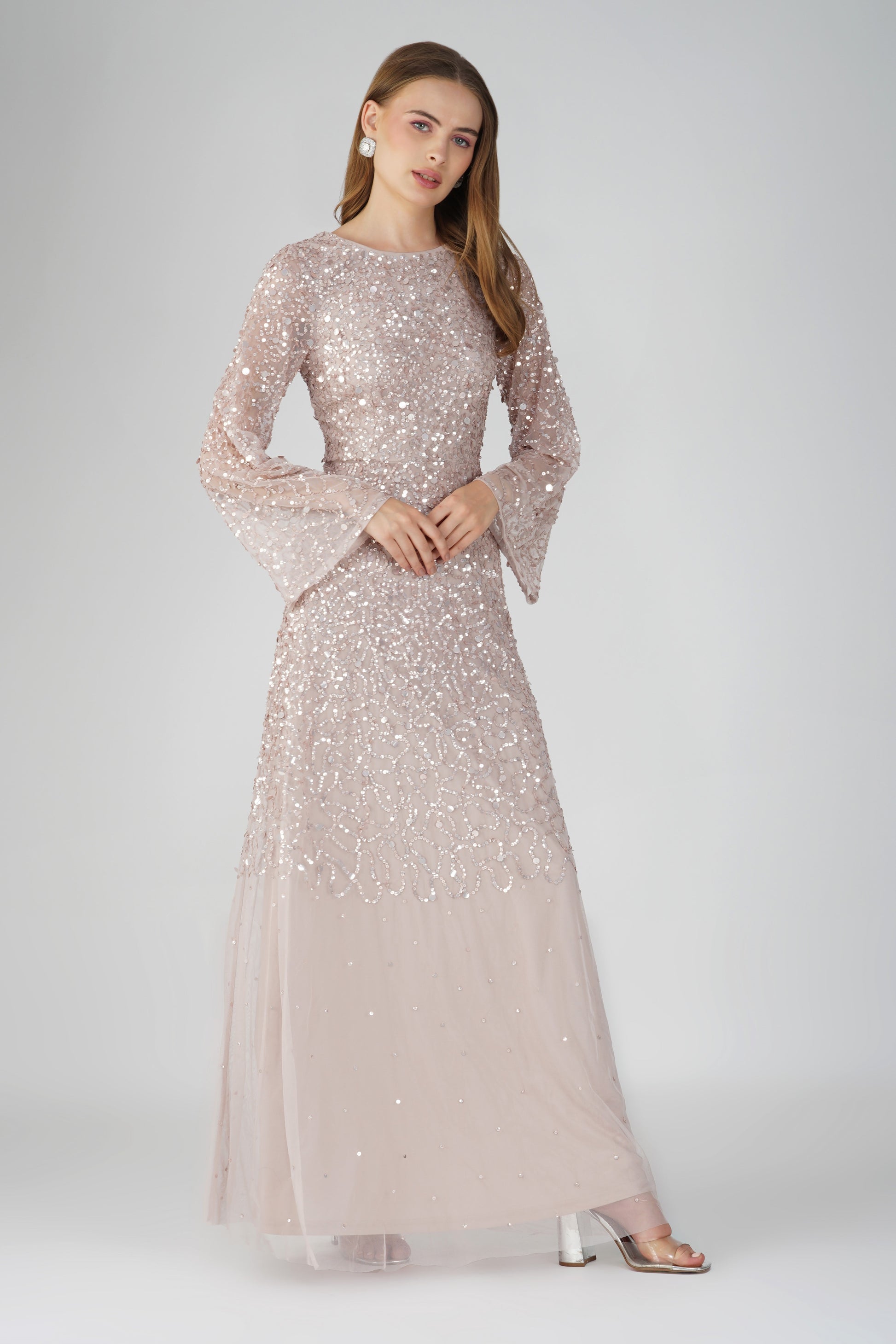 Lace & Beads Diane Long Sleeve Embellished Maxi Dress in Mink. A sequin embellished gown that features long sleeves to add an elegant touch, a zip-back closure, beautiful mink sequins, and a floor-length tulle skirt. This bridesmaid dress is the perfect addition to your wedding.? Elevate your wedding guest look this season with this hand embellished gown.?