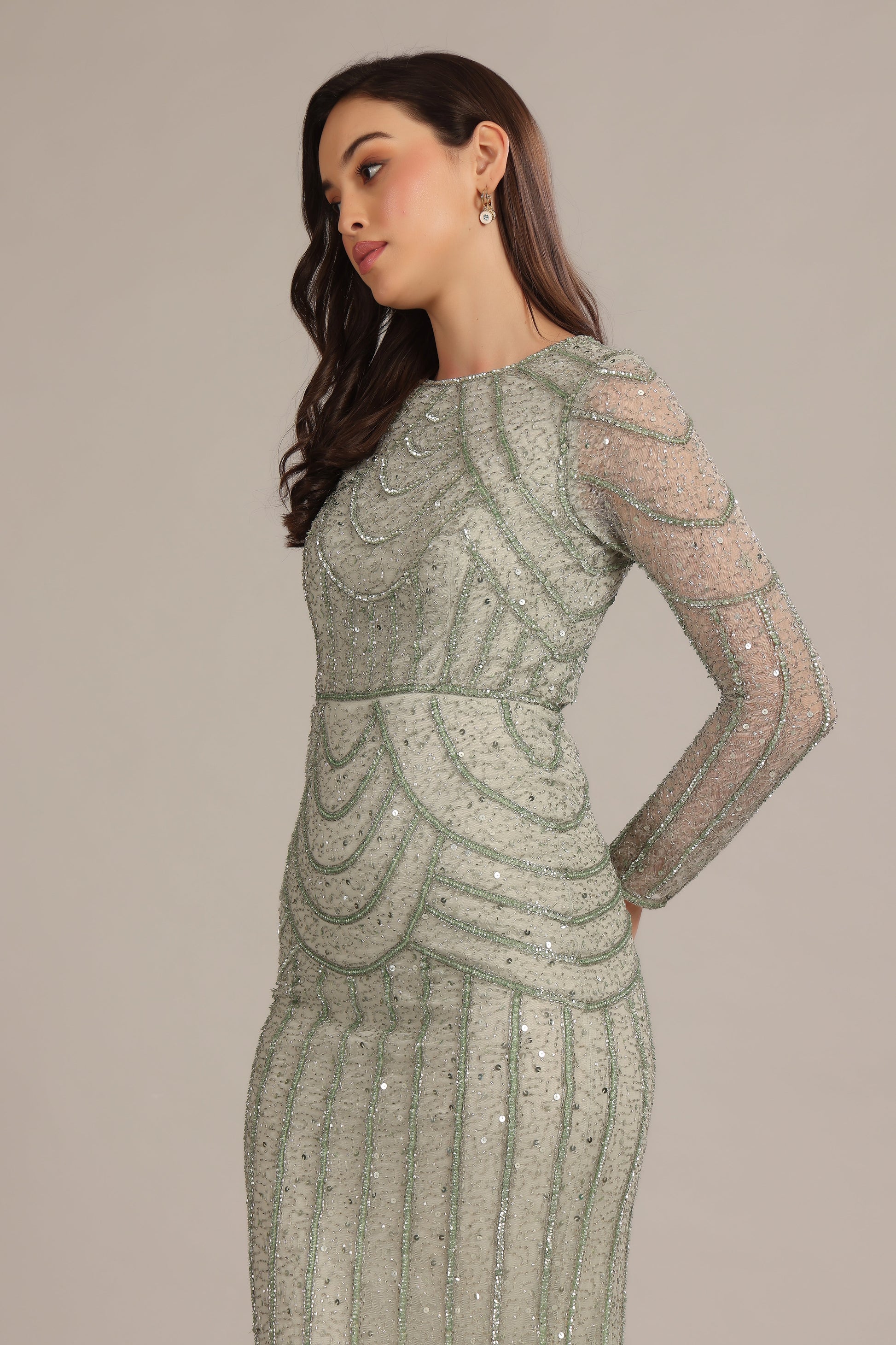 The Lace & Beads Ellis Maxi Dress in Sage Green is an elegant choice for formal occasions. Its hand-embellished sequin top adds sparkle, while the high neckline and long sleeves offer a refined, modest look. The flowing A-line skirt flatters as it cascades to the floor, making it perfect for weddings, galas, or special events.