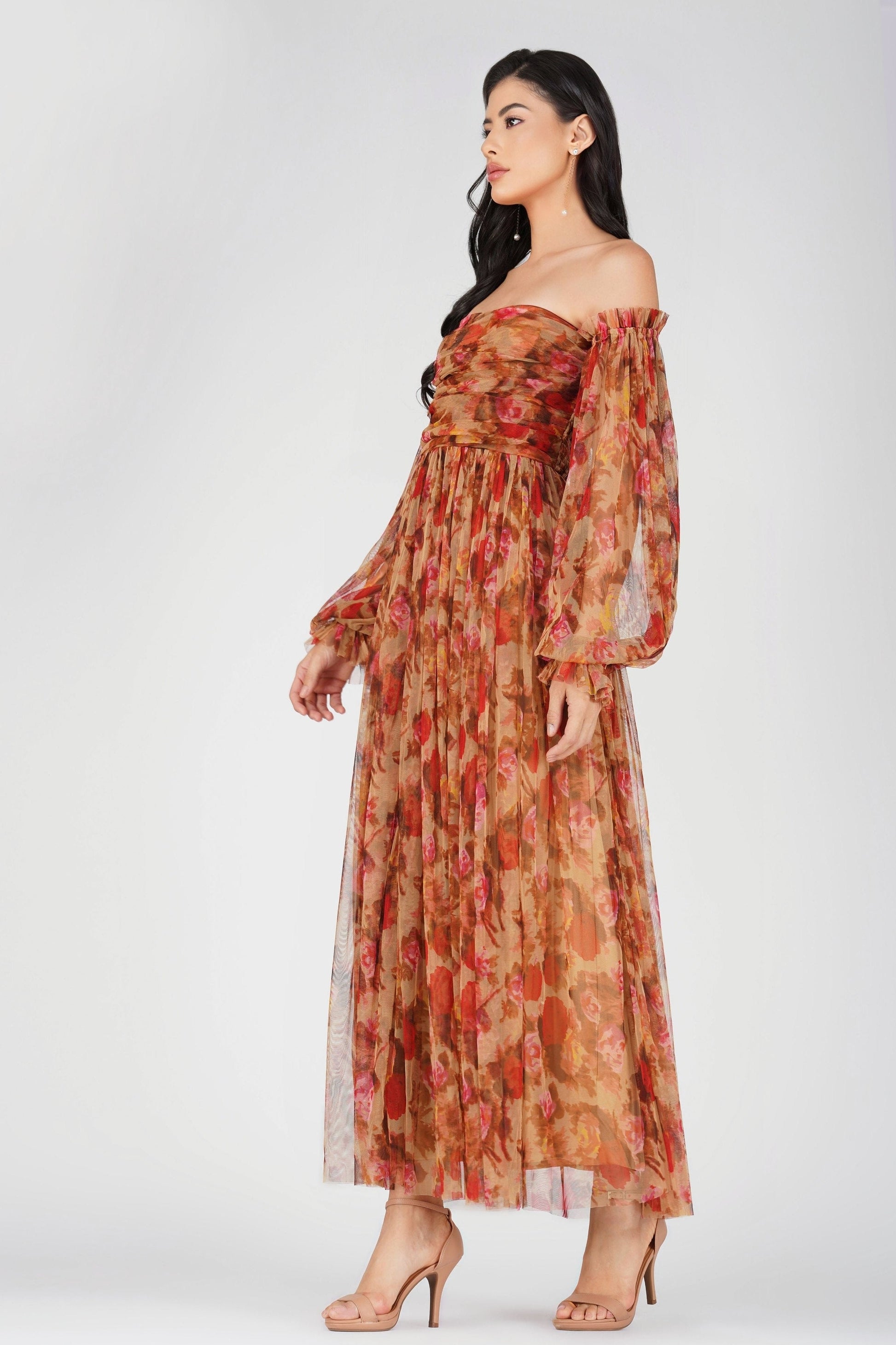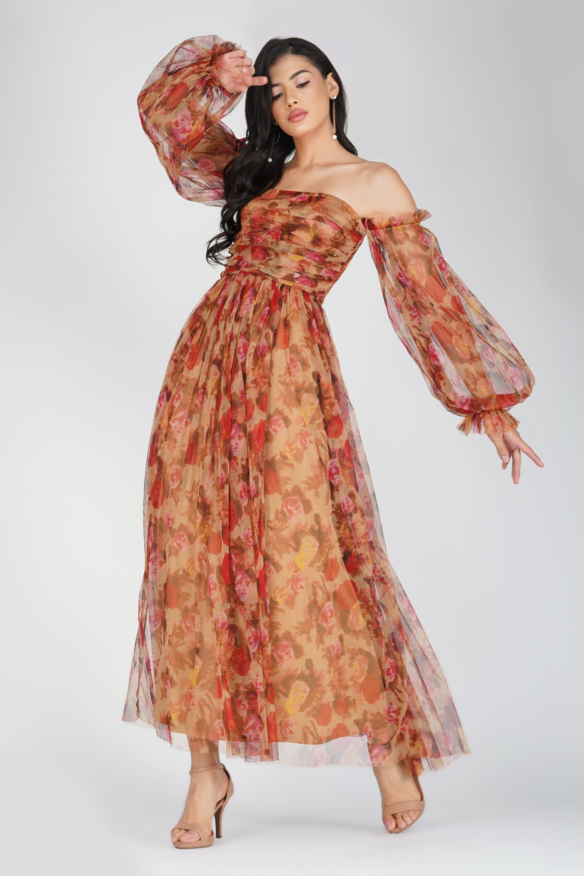 Lace & Beads Lana rose floral printed off-shoulder maxi dress. This floral tulle dress features a rose floral print throughout, a sheer off-the-shoulder sleeve, and a flattering pleated top.?It is an elegant dress that features a flattering flowing tulle skirt.?We love this floral tulle dress as a great option for all your special occasions. Dress it up as a pretty bridesmaid dress, or a floral wedding guest dress, or dress it down as a rose floral holiday dress. Wear the sleeves on the shoulder or off-the-shoulder - it is a versatile and beautiful floral maxi dress that is sure to make an impact, whatever the occasion.