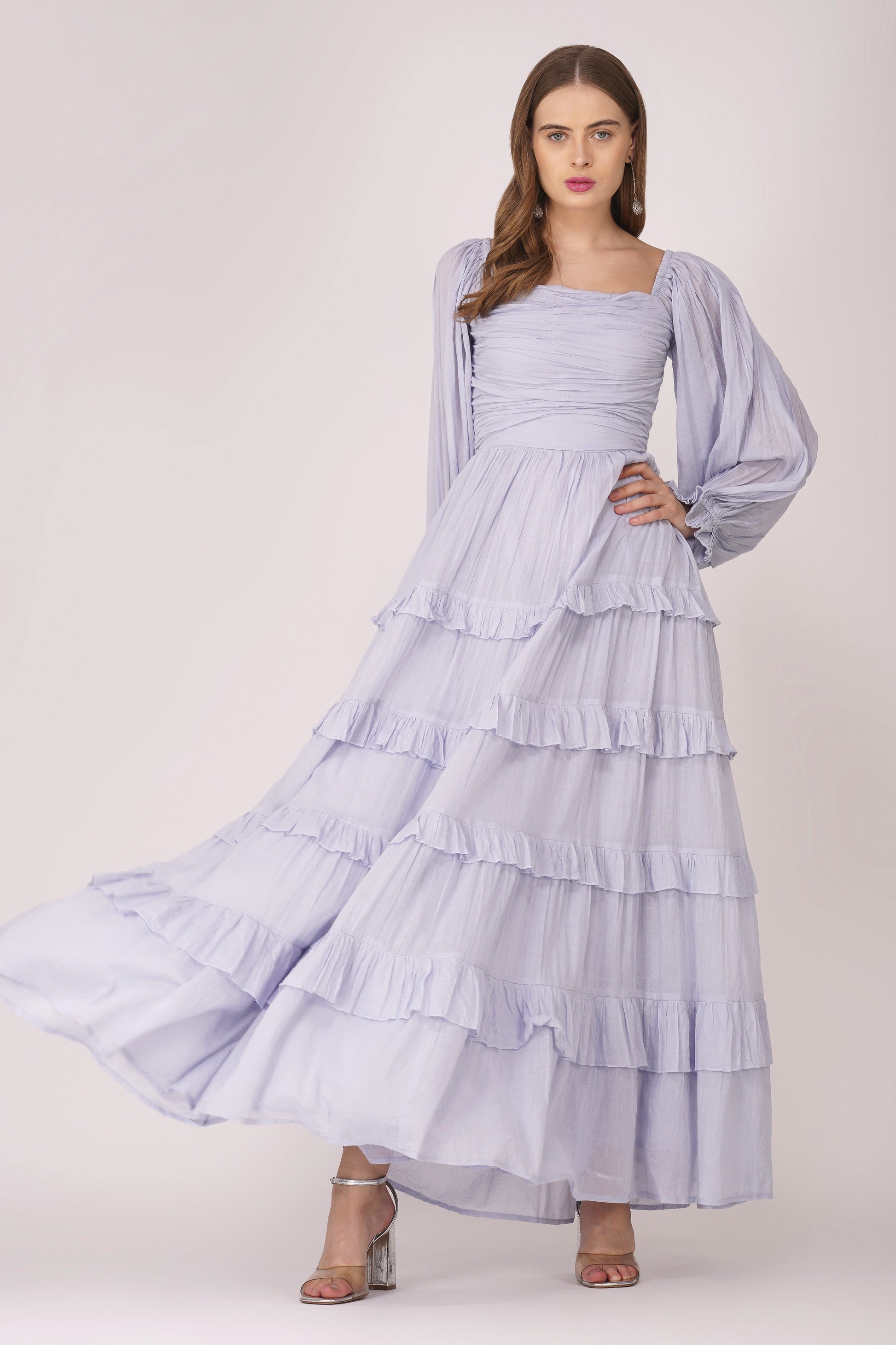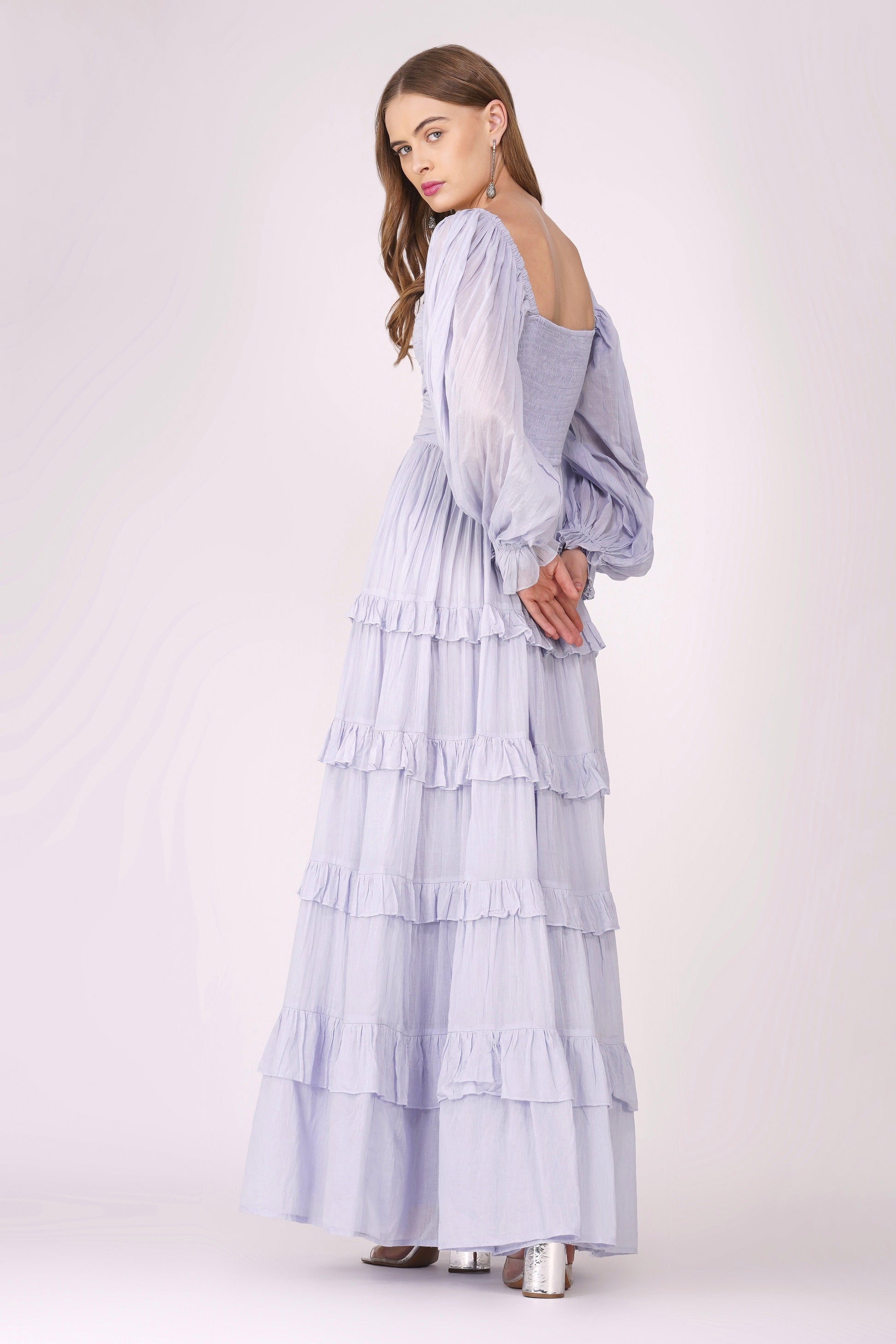 Lace & Beads Lane Cotton Maxi Dress in Blue. This effortless cotton maxi dress displays a soft blue colour throughout, tiered skirt and a flattering wrapped bodice with a shirred back.
