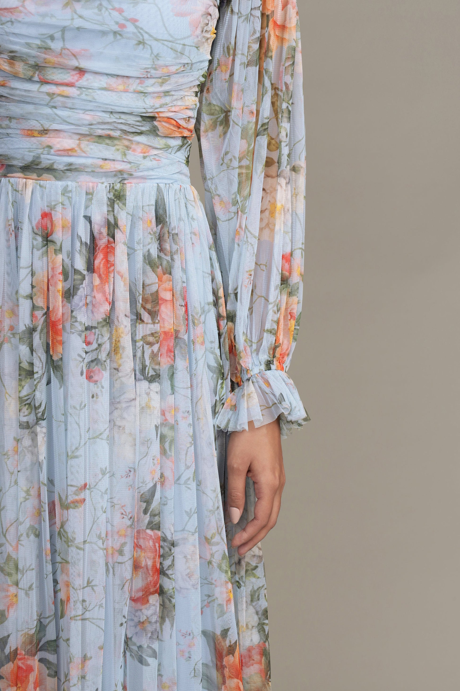 Lace & Beads Lana Maxi Dress in Blue Floral Print. Elegantly designed, the Lana Maxi Dress combines style and versatility for all your special occasions. Featuring a captivating soft blue floral print, the tulle sleeves can be worn on or off the shoulders. The wrapped bodice has a shirred back which provides you with a custom fit.??