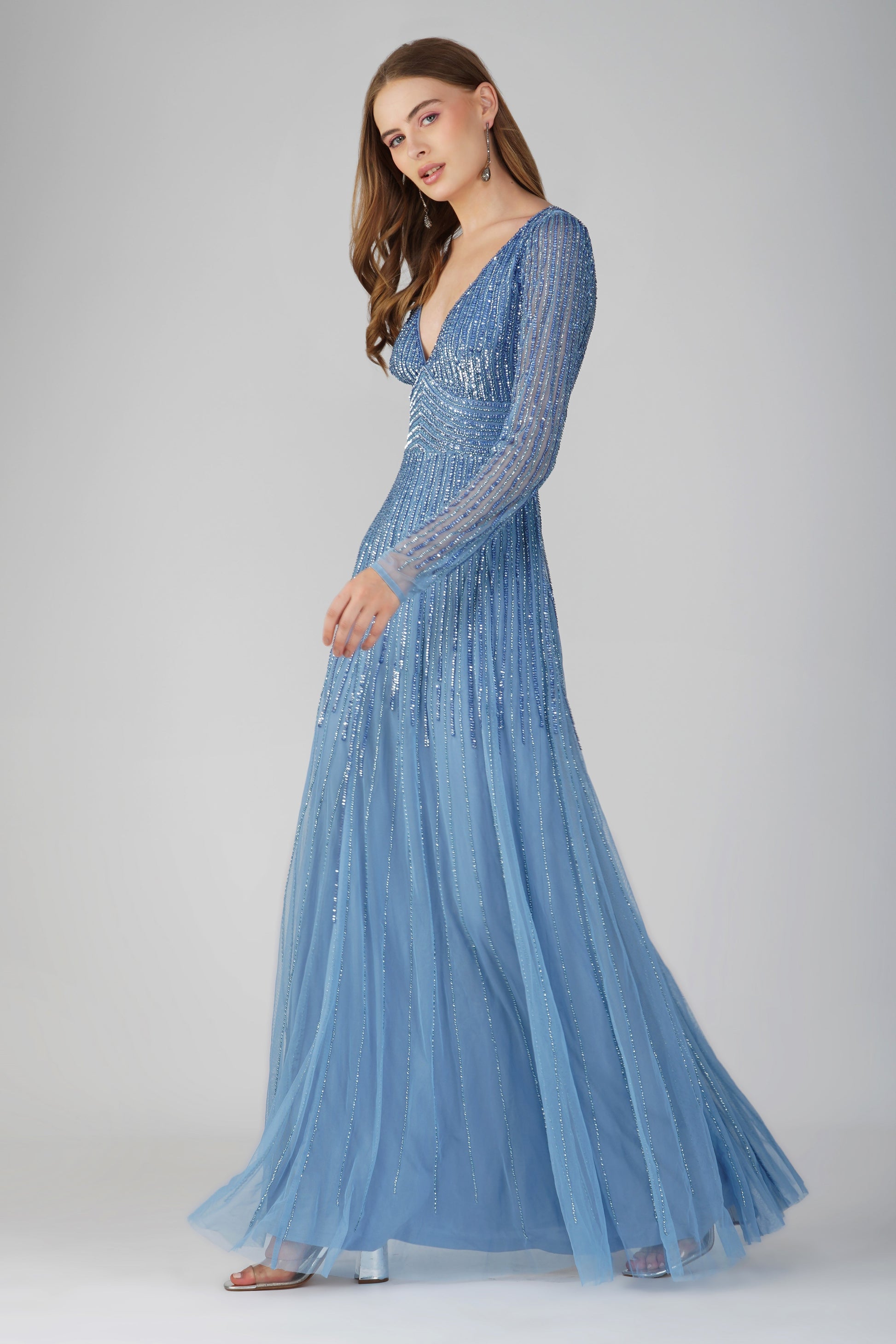 Lace & Beads Laura Embellished Maxi Dress in Powder Blue. Laura Maxi Dress is a dazzling powder blue gown featuring intricate embellishments. The dress has a sophisticated V-neckline, long sheer sleeves, and a floor-length skirt that creates an elegant and flowing silhouette. The shimmering details add a touch of glamour, making it ideal for evening or black tie events.