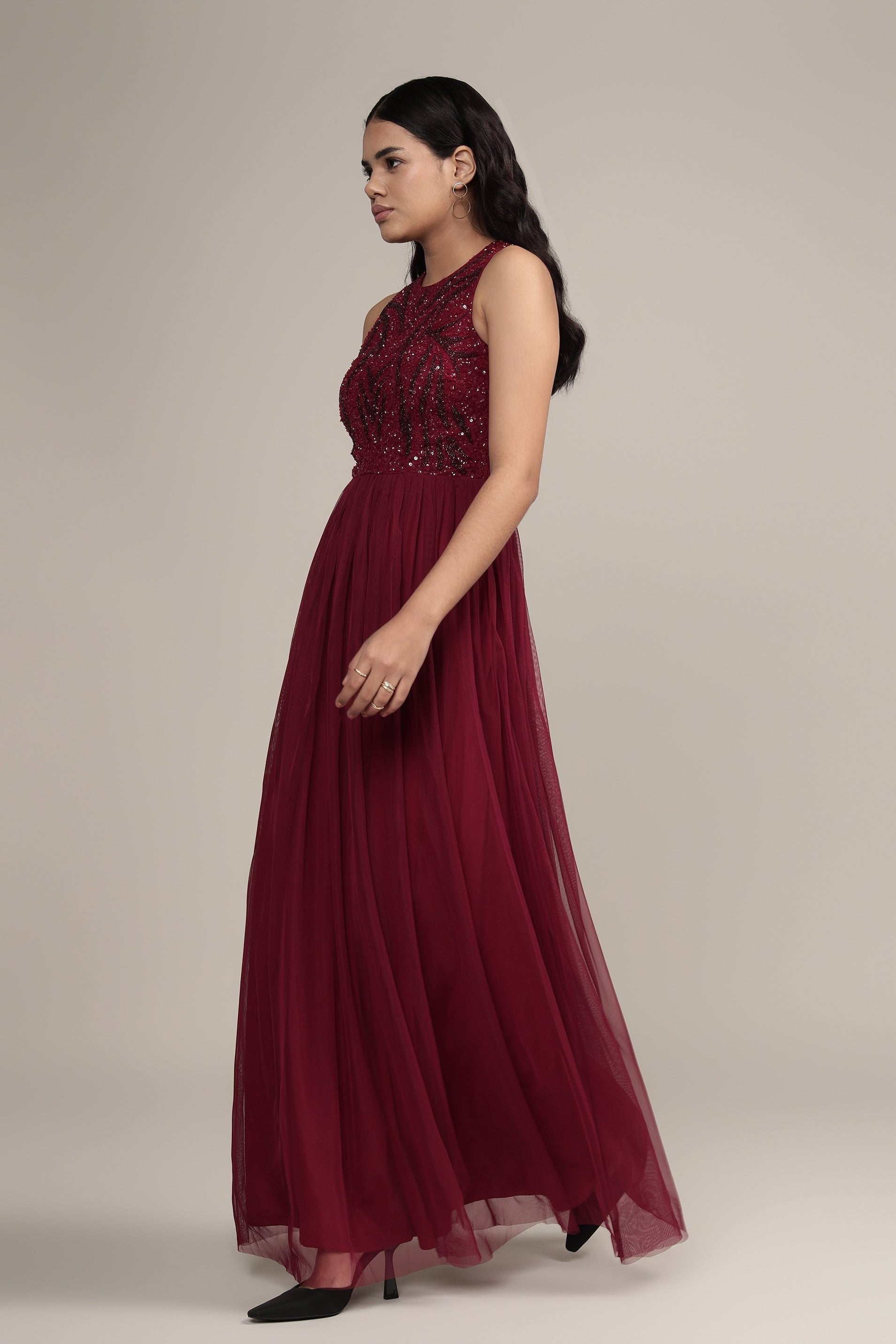 Lace & Beads Linda Embellished Maxi Dress in Burgundy features a beautiful hand-embellished sequin top and lined tulle skirt for a more comfortable fit.