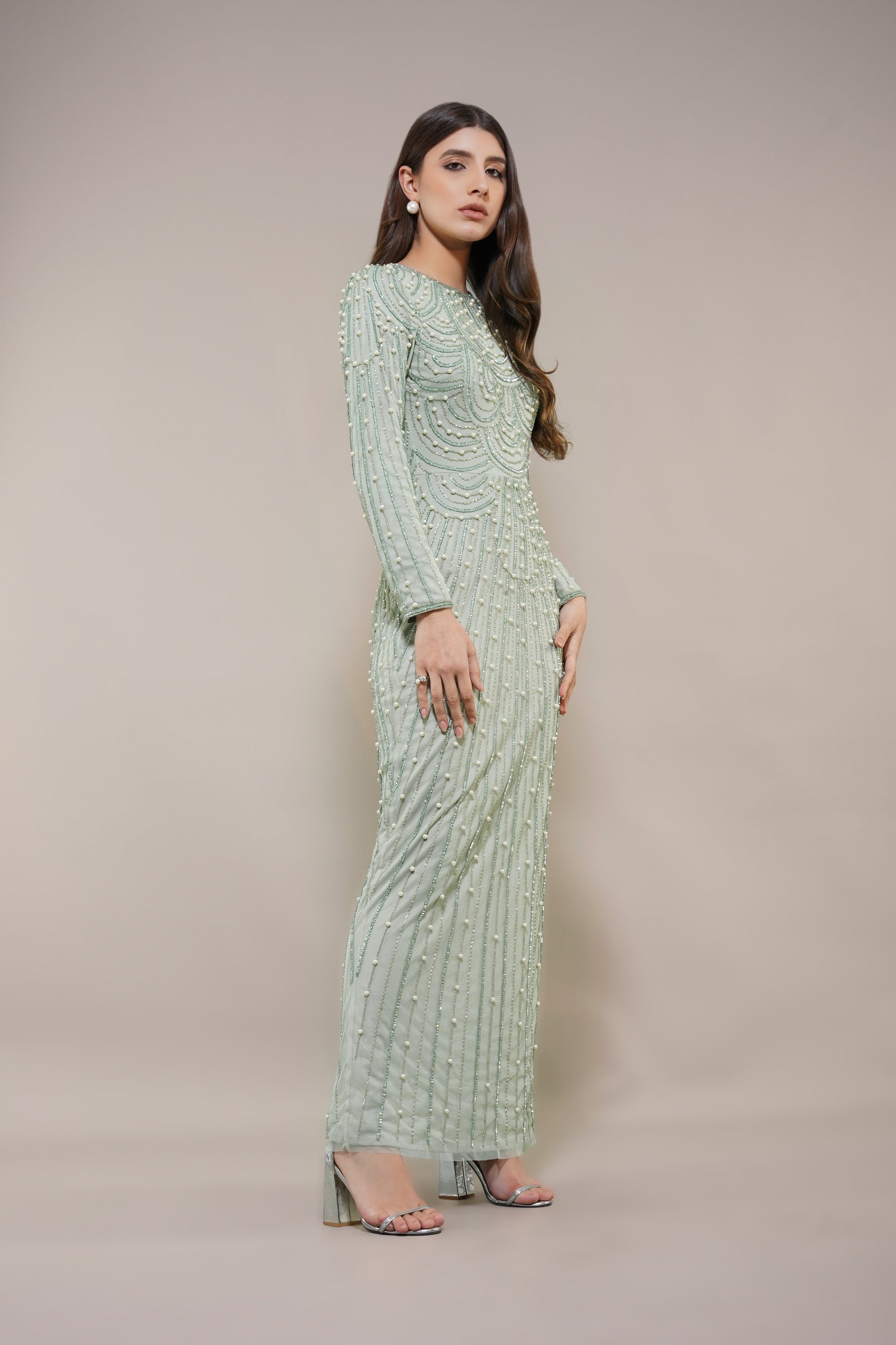 Lace & Beads Mabel Embellished Maxi Dress in Pistachio. This gown is the perfect mix of elegance and vintage charm. With its stunning hand-embellished beadwork, high neckline, and long sleeves, this modest dress is effortlessly sophisticated while still feeling modern. The figure-skimming fit and delicate pearl details give it a dreamy, art-deco-inspired vibe¡ªperfect for weddings and other special occasions.?
