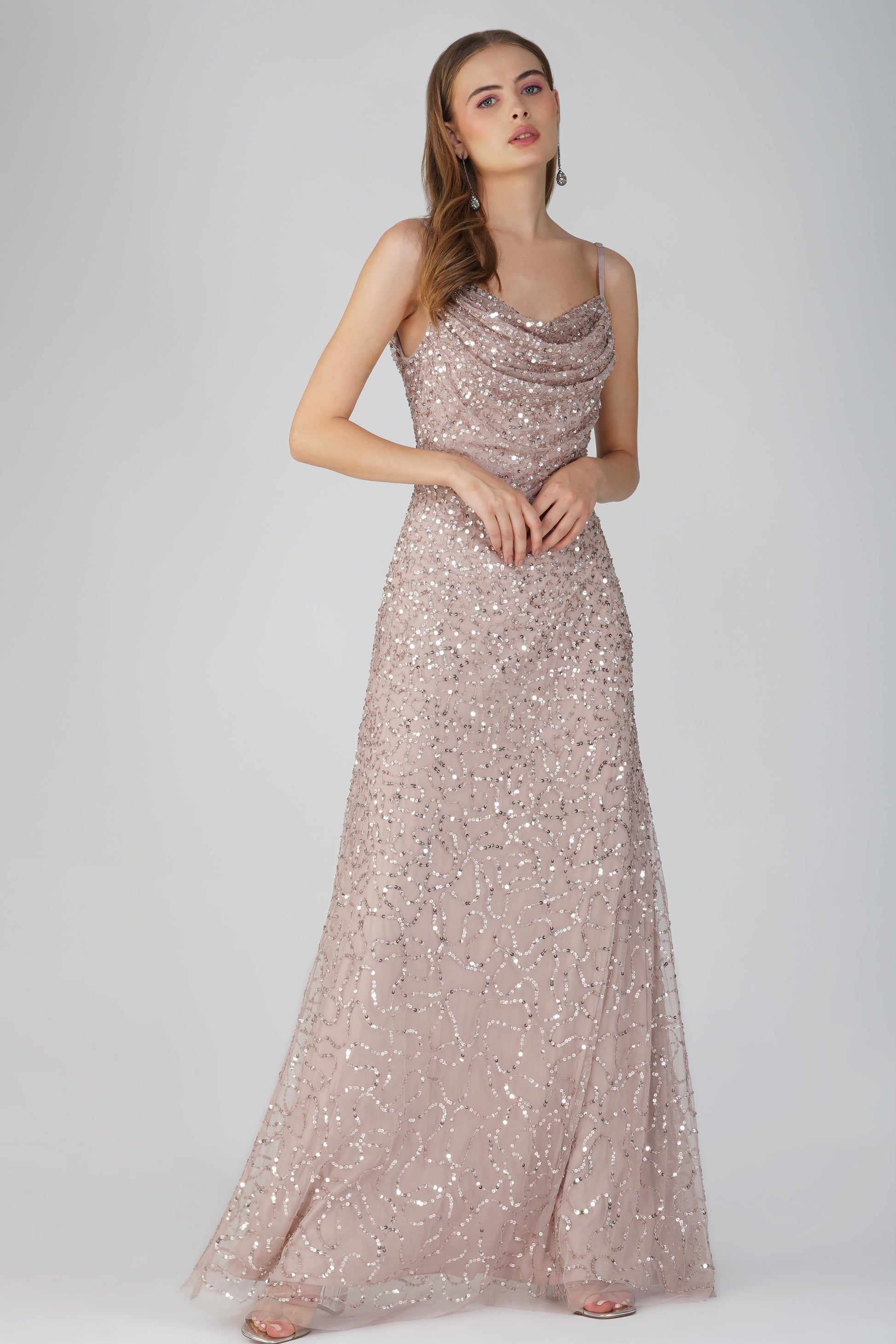 Lace & Beads Mai Embellished Maxi Dress in Blush Pink. This meticulously hand embellished sultry gown features a flattering cowl neckline, adjustable straps and a-line skirt. The perfect maxi dress for a bridesmaid, wedding guest or cocktail party.?