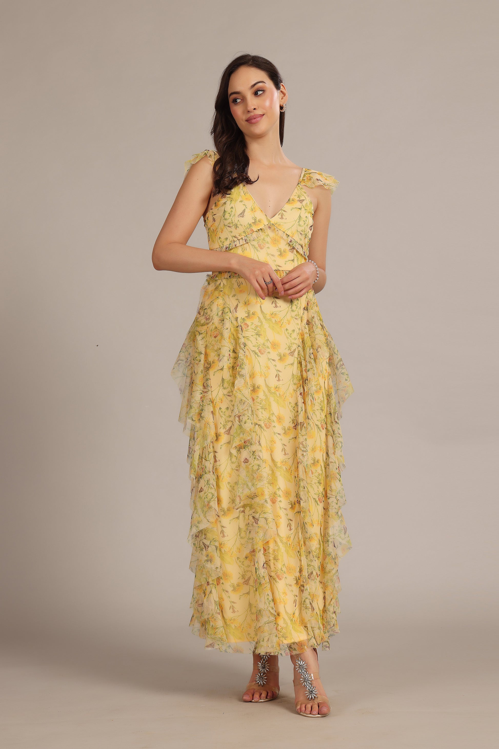 Lace & Beads Malin Maxi Dress in Yellow Floral. Turn heads at your next event in the Malin Maxi Dress in Yellow Floral. This elegant floral maxi dress is designed with a flattering V-neckline, short butterfly sleeves, and a flowy tiered skirt ¨C perfect for weddings, garden parties and special occasions.