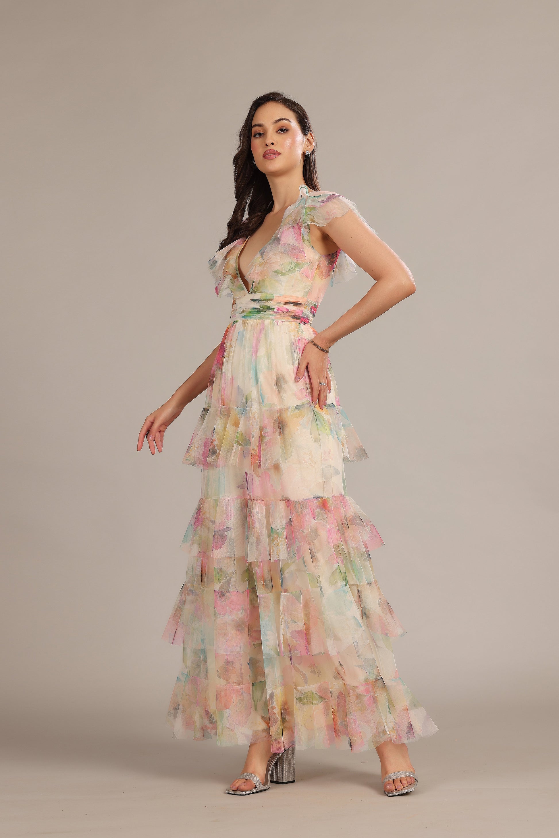 Lace & Beads Olympia Maxi Dress in Cream Pink Floral. Step into your fairycore era with the Olympia Maxi Dress in Cream Pink Floral ¨C the ultimate dreamy look for weddings, garden parties, or any special moment. This flowy, tiered dress features soft pastel florals on a sheer tulle overlay, with fluttery ruffle sleeves and a deep V-neck that adds just the right touch of drama. The cinched waist and floaty layers give it that effortless, romantic vibe that¡¯s made to twirl in. Pair it with strappy heels and dainty jewelry for a look that feels straight out of a storybook.