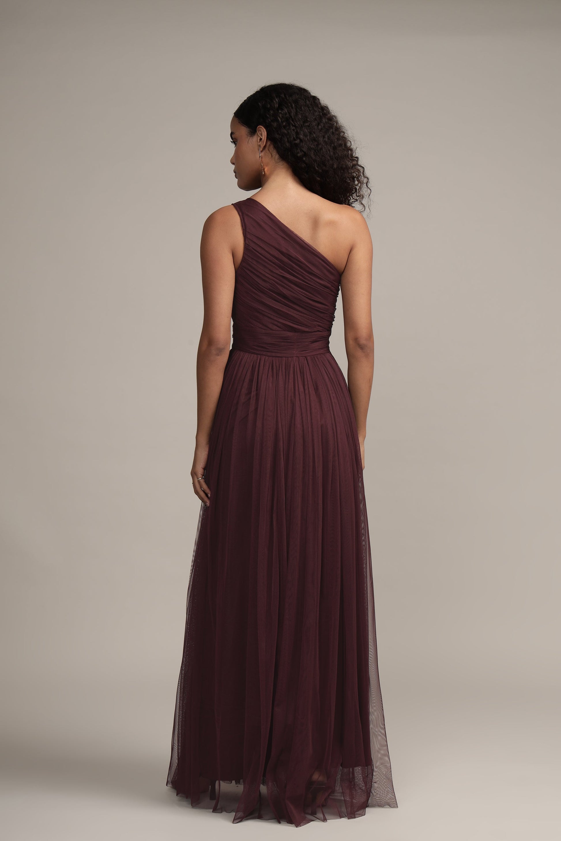 Lace & Beads One Shoulder Maxi Dress in Plum. This elegant maxi dress boasts a popular one-shoulder design. The mesh material is lightweight, giving it a soft, flowy look. The dress is fitted at the waist, creating a flattering silhouette that flares out into a full-length skirt.