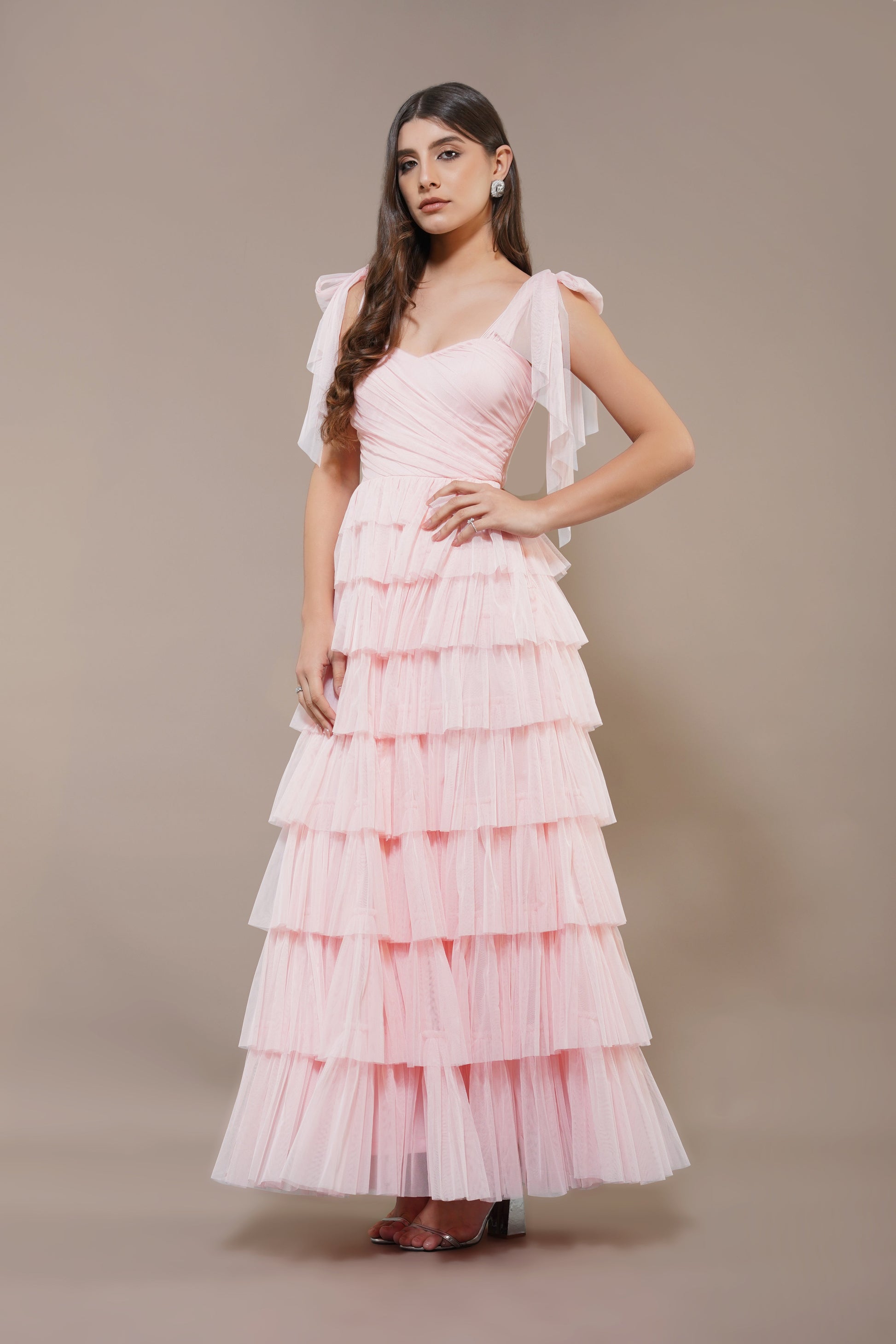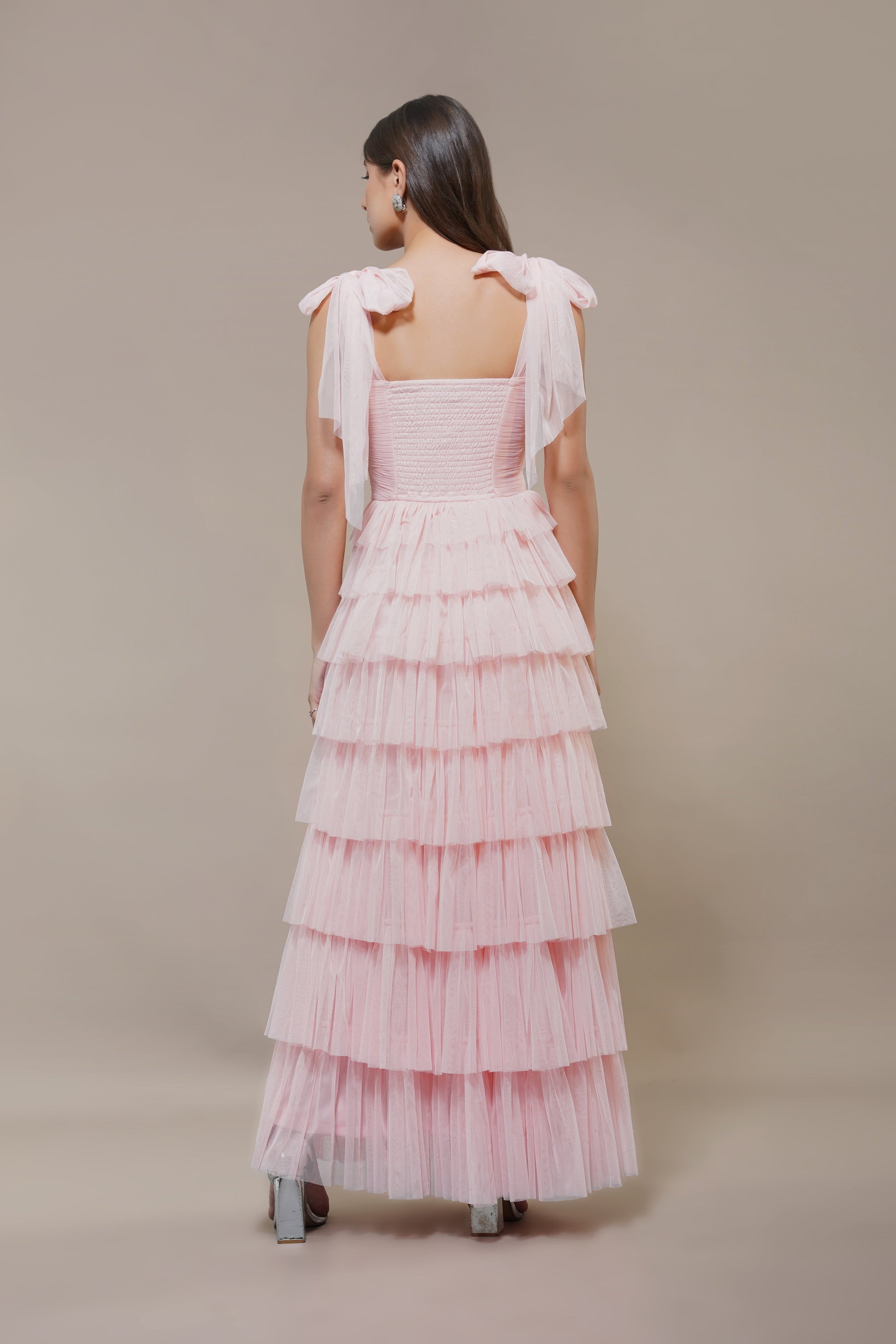 Featuring delicate shoulder ties and a layered skirt design, the Ophelia dress is perfect for special occasions. Whether you're attending a garden party or a wedding this pink dress promises to make a captivating statement.