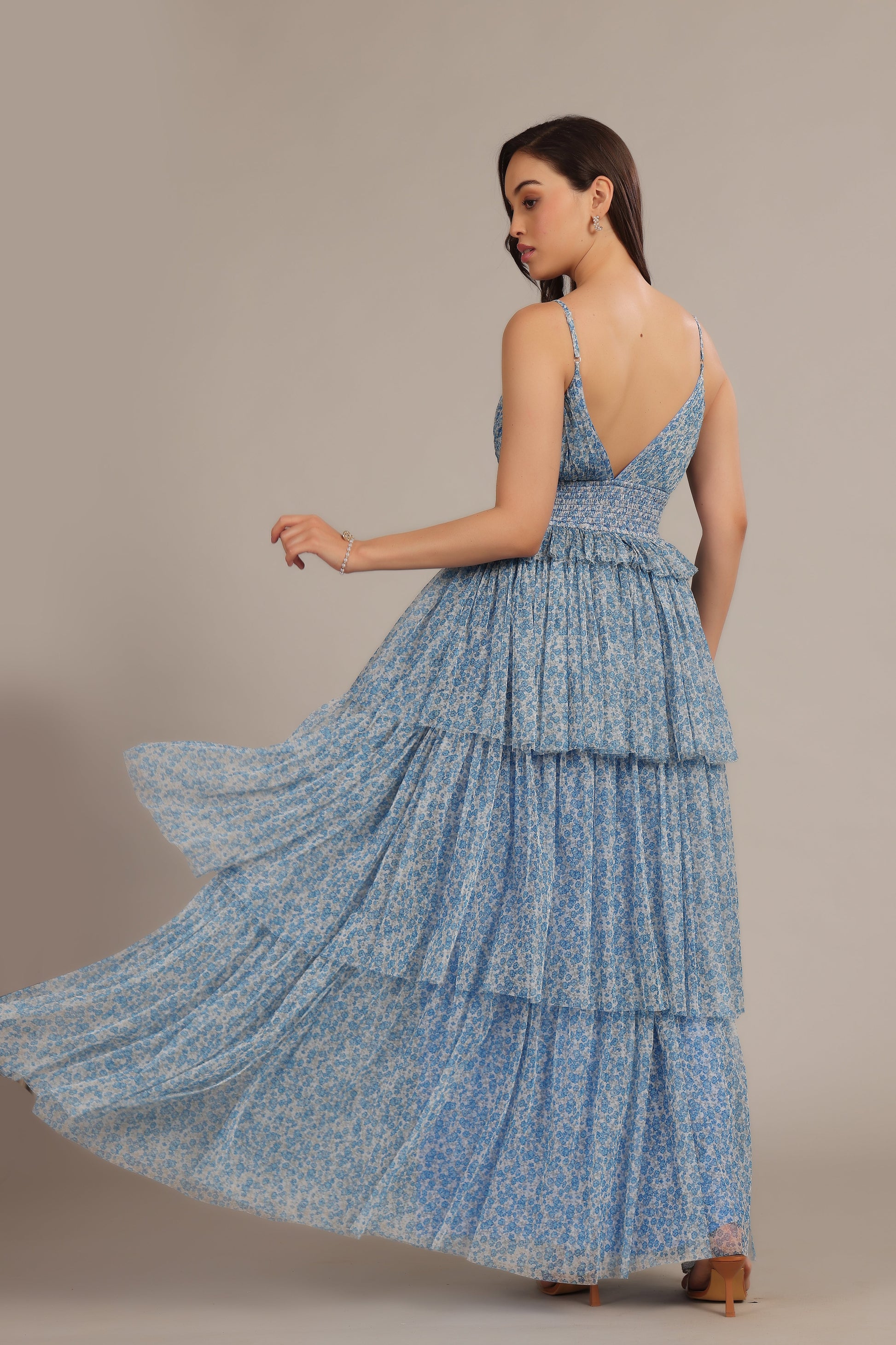 Lace & Beads Rani Maxi Dress in Ditsy Blue Floral. A?graceful, romantic piece designed to make a subtle statement. With its tiered silhouette, soft floral print, and flattering smocked waist, this dress brings effortless elegance to any occasion. The deep V-neckline and delicate straps add a touch of femininity, while the flowing layers create beautiful movement as you walk. Perfect for garden parties, weddings, or warm evenings out, the Rani is a timeless addition to your summer wardrobe.