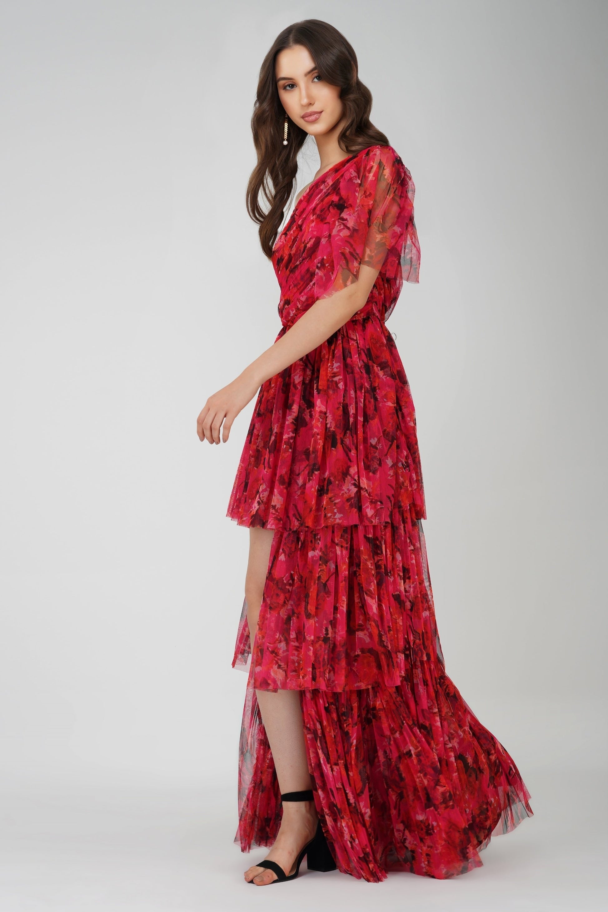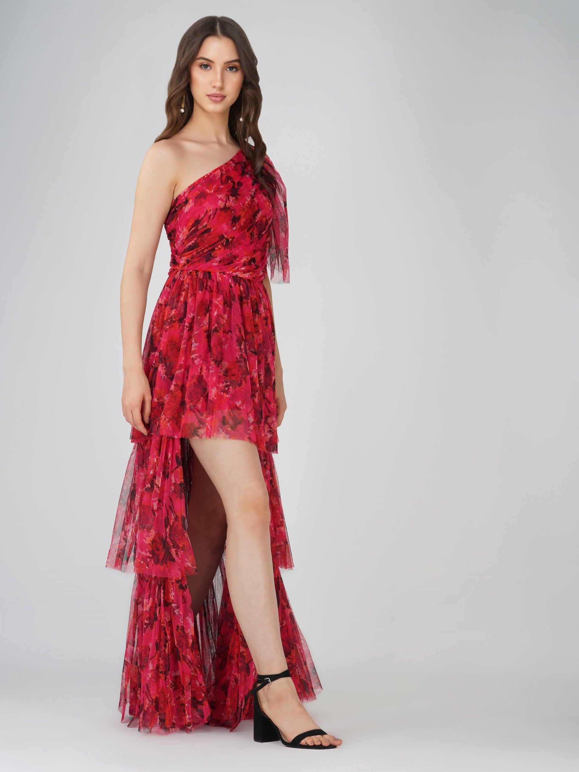 Lace & Beads Rowena red pink printed one-shoulder mesh maxi dress.? A stunning rose-printed maxi dress that is created to turn heads.
