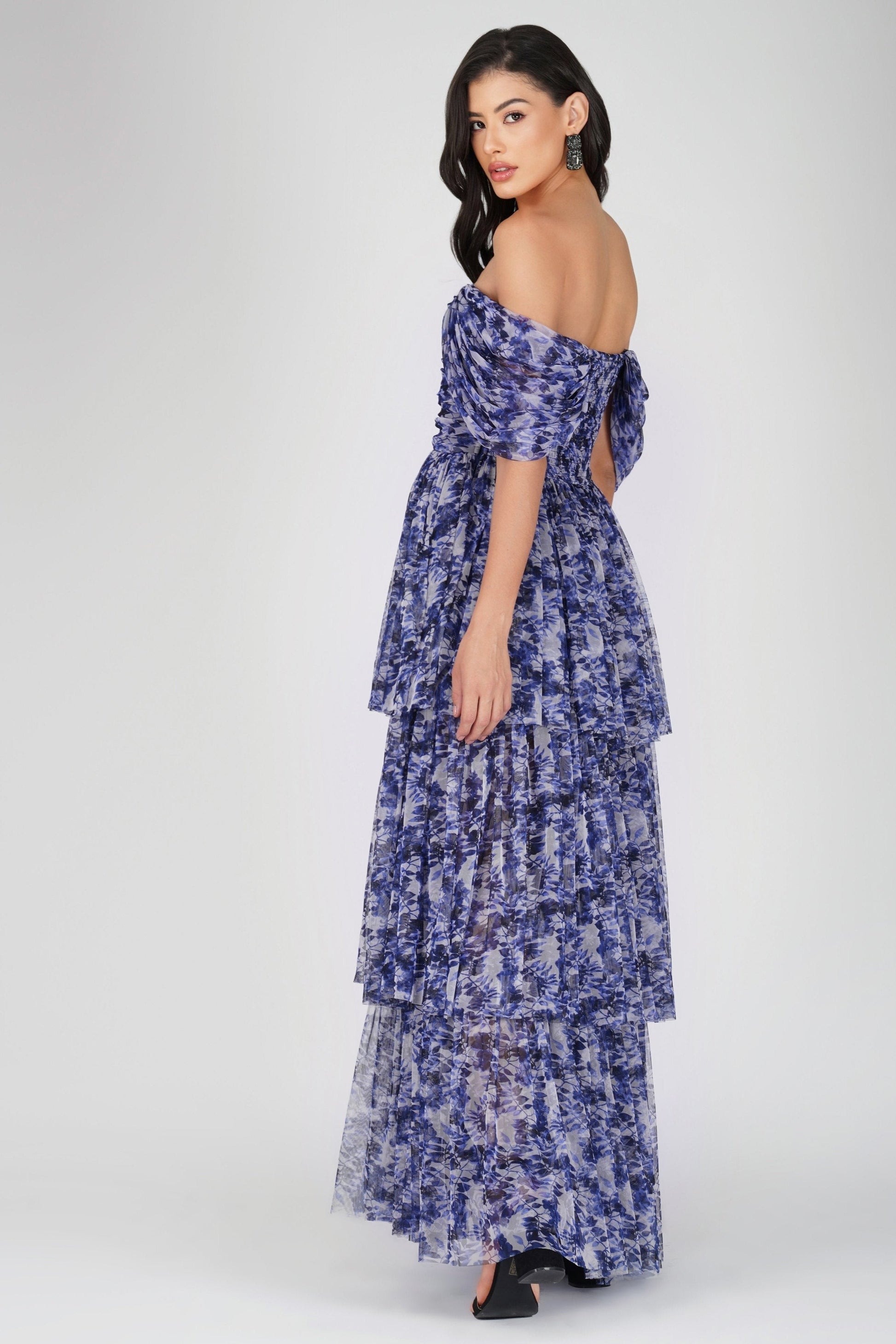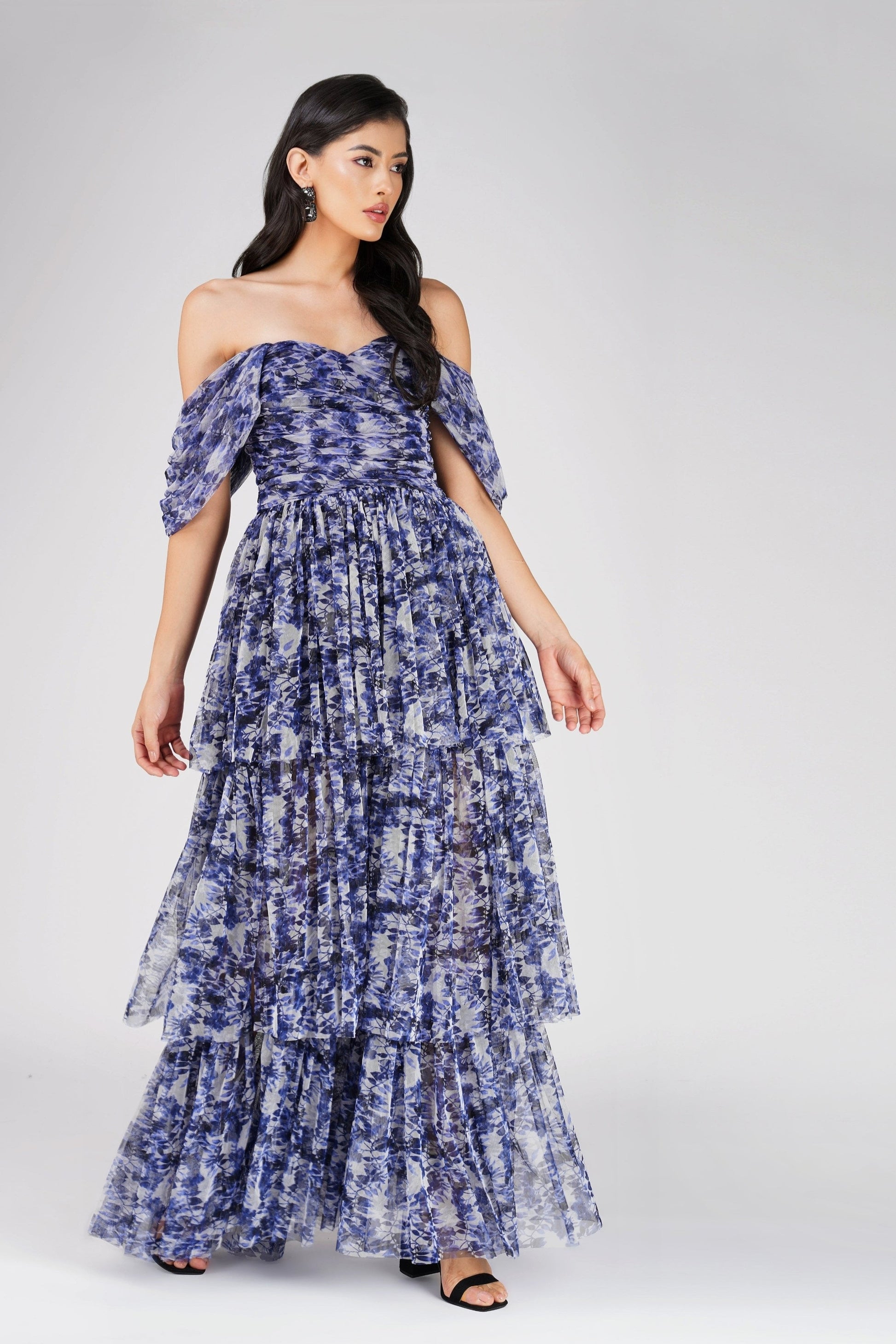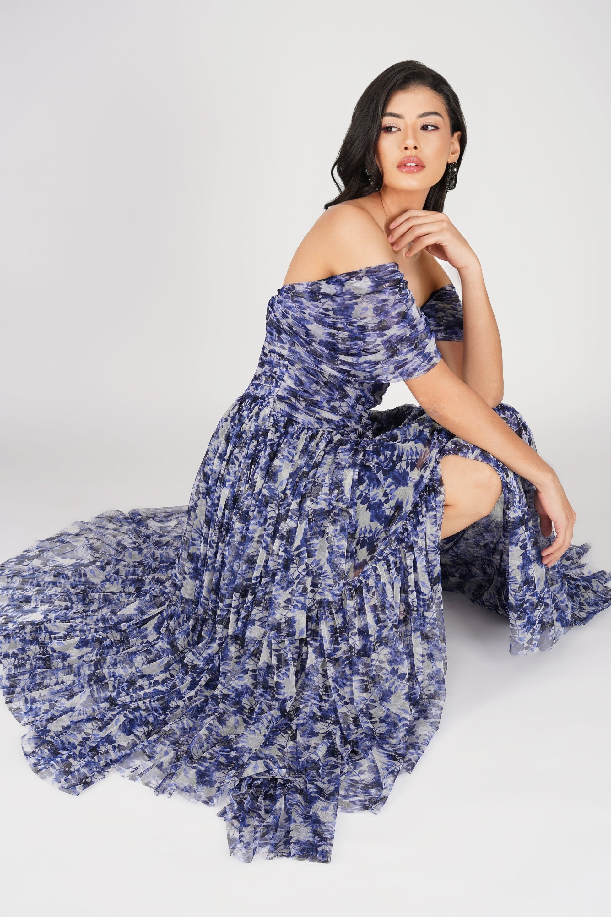Sydney Tulle Maxi Dress in Blue Leaf Print
