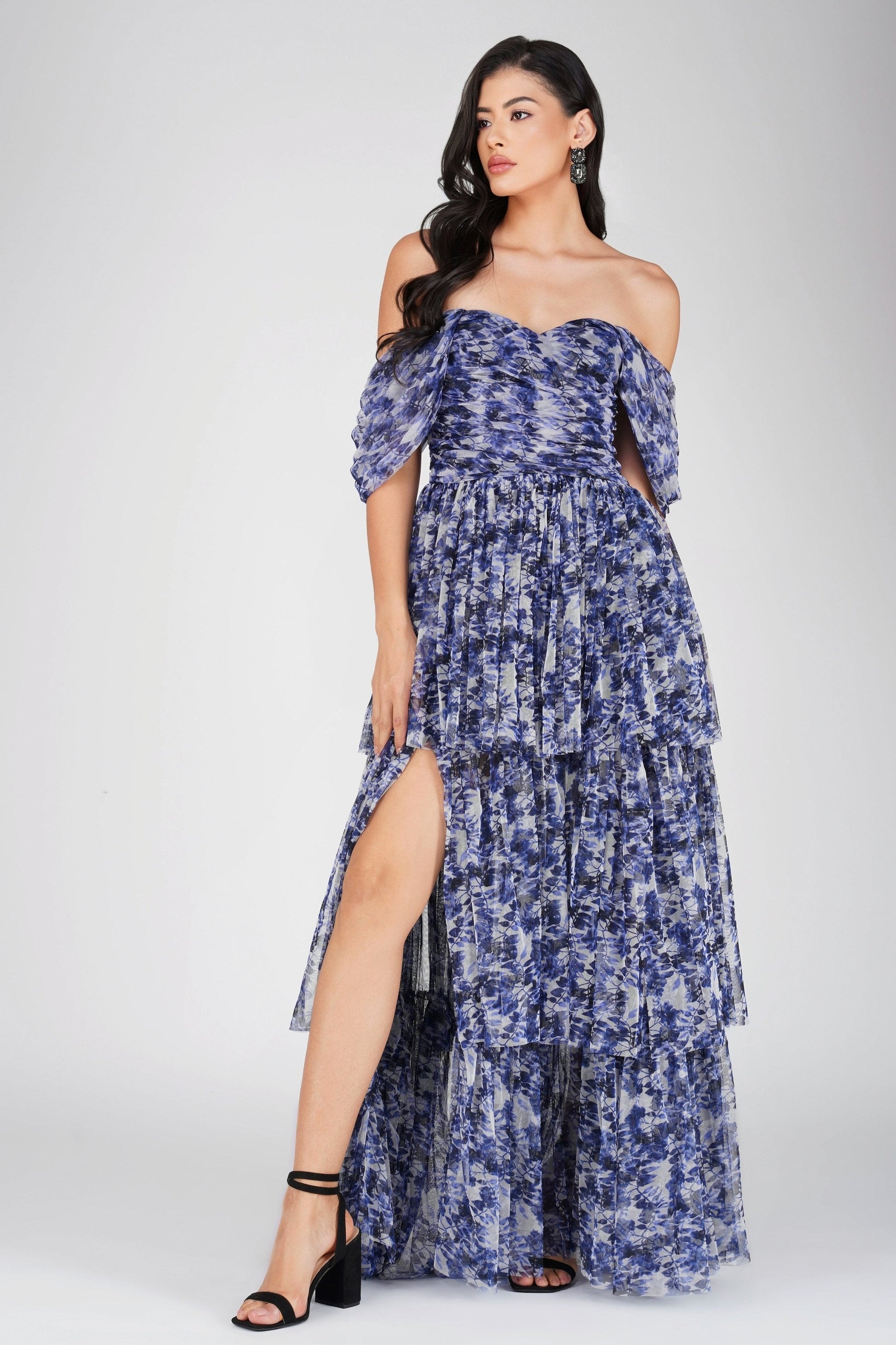 Lace & Beads Sydney blue tulle maxi dress featuring a thigh-high split, a wrapped bodice, and a shirred stretchy back for a flattering fit.