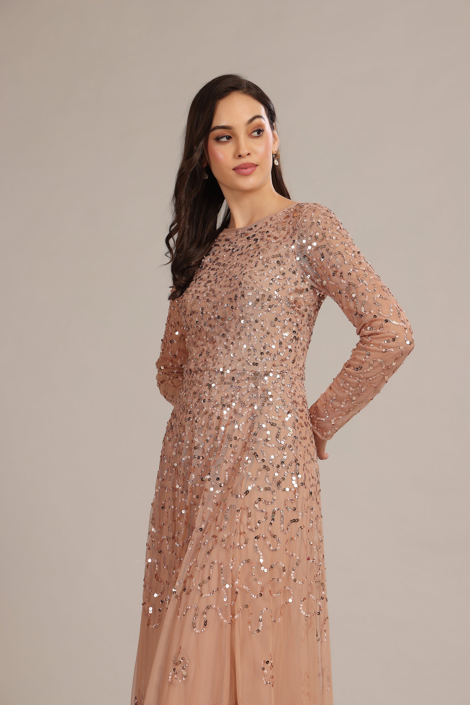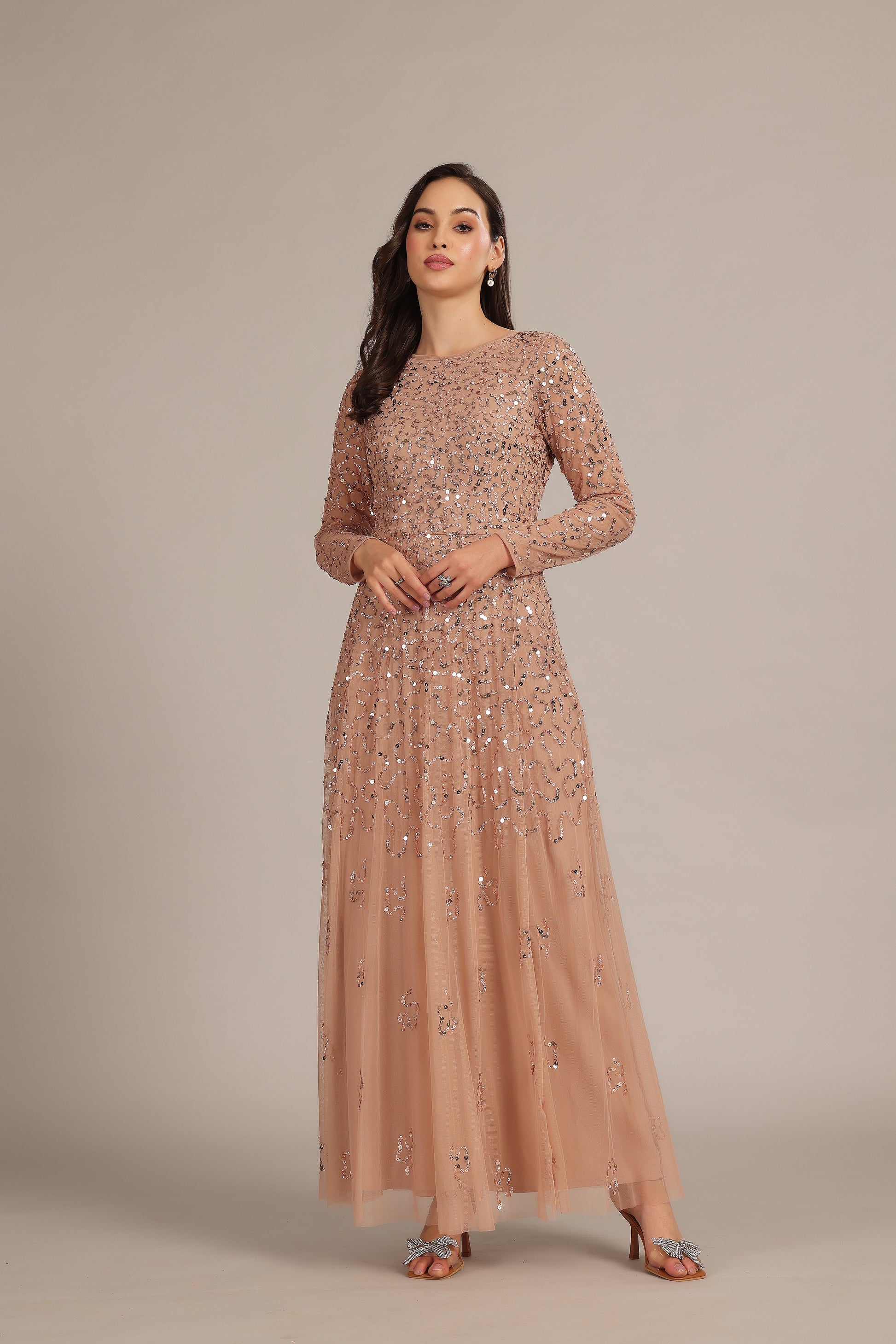 Lace & Beads Sila Maxi Dress in Mink. This long sleeve bridesmaid dress features all-over sequin throughout the dress. It has a high round neckline with a flattering sweetheart lining. The floor-length?skirt is crafted in an a-line shape and hand-embellished with a gradient of sequins. It is a beautiful option if you are looking for a modest bridesmaid dress. The hand-embellishment combined with the flattering silhouette makes it the perfect occasion dress, whether you are looking for a modest occasionwear dress, a long sleeve wedding guest dress, or a timeless dress for your next special occasion. Add this timeless gown to your occasionwear wardrobe.