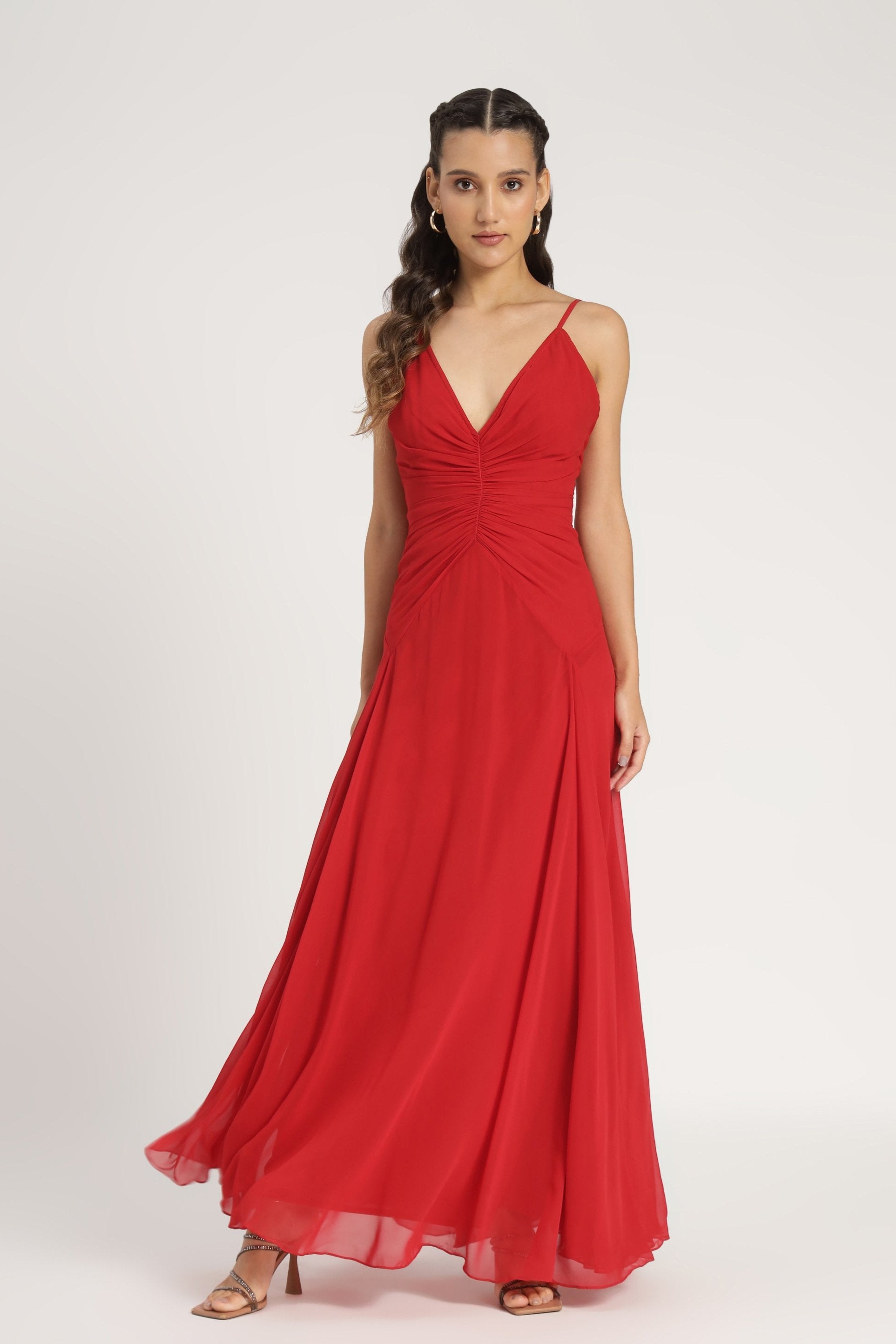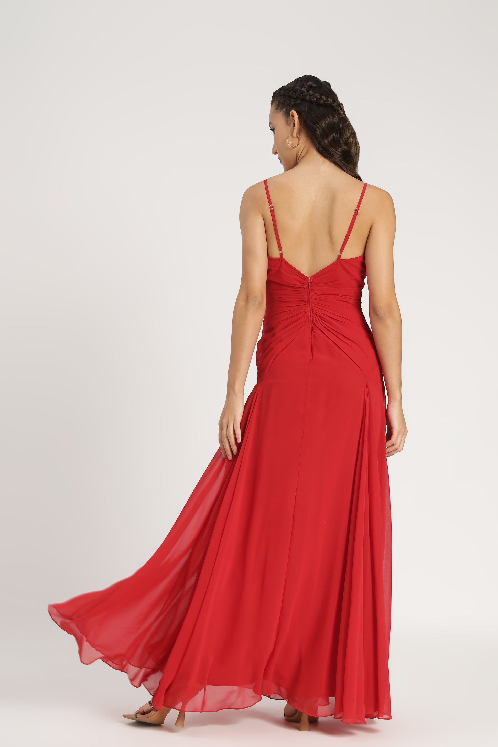 The plunge neckline and flattering pleated bodice flows into a swishing godet skirt. The vibrant red is both daring and romantic, ensuring you¡¯ll stand out with confidence. Pair it with neutral heels and dainty accessories to complete this head-turning ensemble.